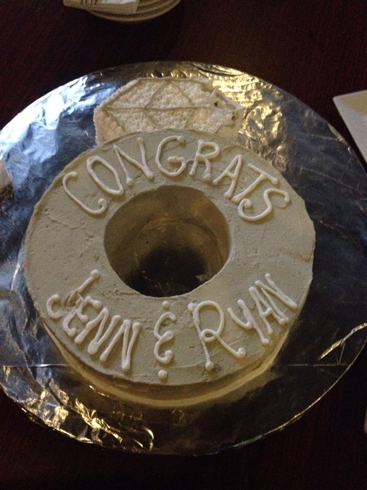 We proceeded to drink wine, and bought a few bottles to take home, one of which will be saved for our wedding next year. After that, we wound our day at the Festival of the Sea down, and headed back for a much-needed nap. During the downtime, we told the people we wanted to know the news but couldn’t immediately see, and recharged our batteries before going out to celebrate. We went to one of our favorite spots called River Rock, a bar and grille on the marina in Brick. The place was more or less destroyed by Hurricane Sandy, but was rebuilt to be even more beautiful than it was before the storm. In a matter of a couple hours after hearing the news earlier in the day, Jenn’s friend and coworker Justine baked us a cake in the shape of an engagement ring and snuck it into the bar without us seeing it. The restaurant staff was gracious enough to hold it in their kitchen, as we later found out. The cake not only looked great, but tasted great as well. There were drinks, there was food, and much celebration until everyone was exhausted.