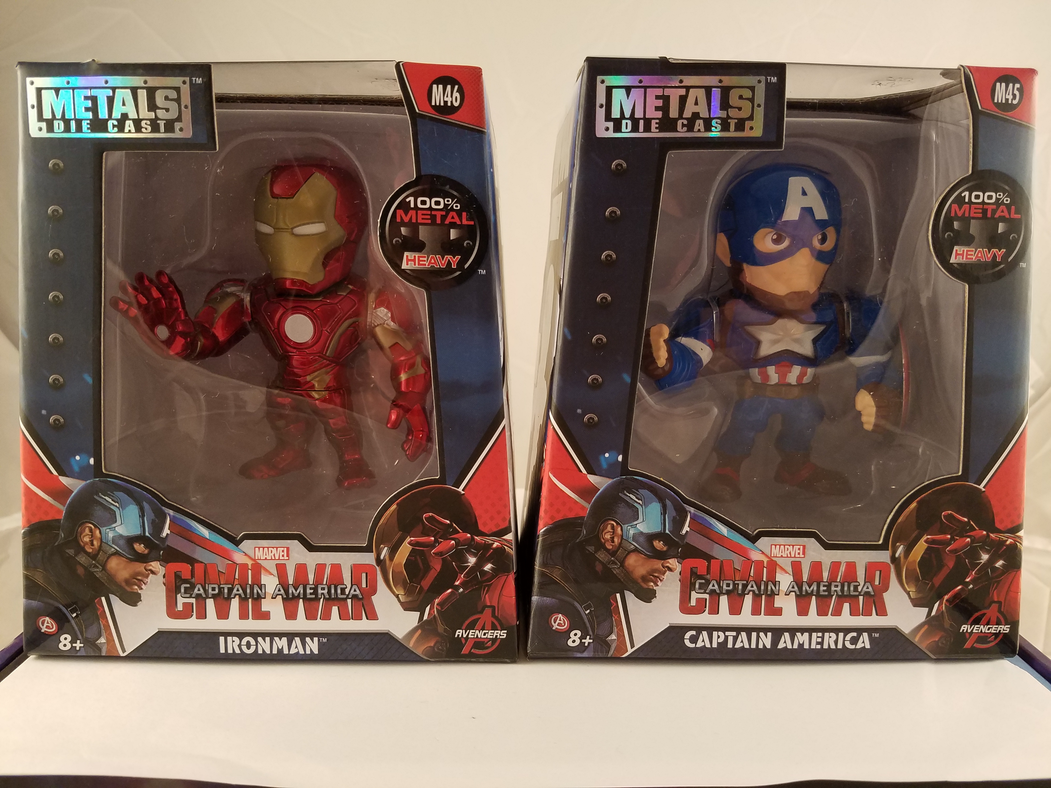 The first of this line that I was able to get my hands on are the Captain America and Iron Man figures from Captain America: Civil War, Marvel’s latest blockbuster movie. Pictured here in their packaging, which warns you that they’re heavy, Cap and Iron Man appear in their shiny, metallic glory, which is only amplified once unshackled from their twist ties and sprung from their cardboard prisons.